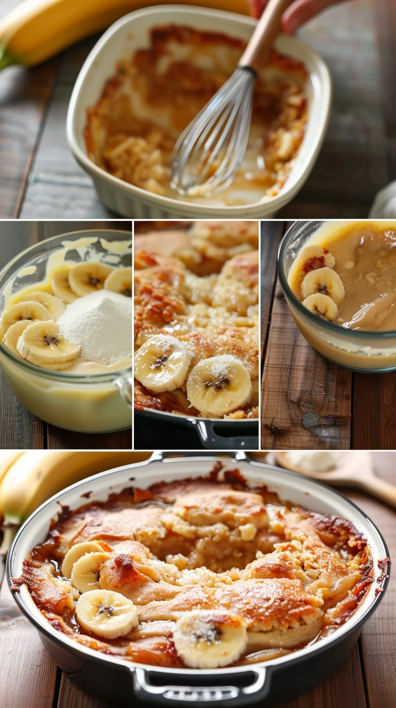 - Banana Base: In a bowl, toss sliced bananas with 1/2 cup sugar, vanilla, and cinnamon. Let sit for 10 minutes, then pour into a greased 8×8 baking dish.